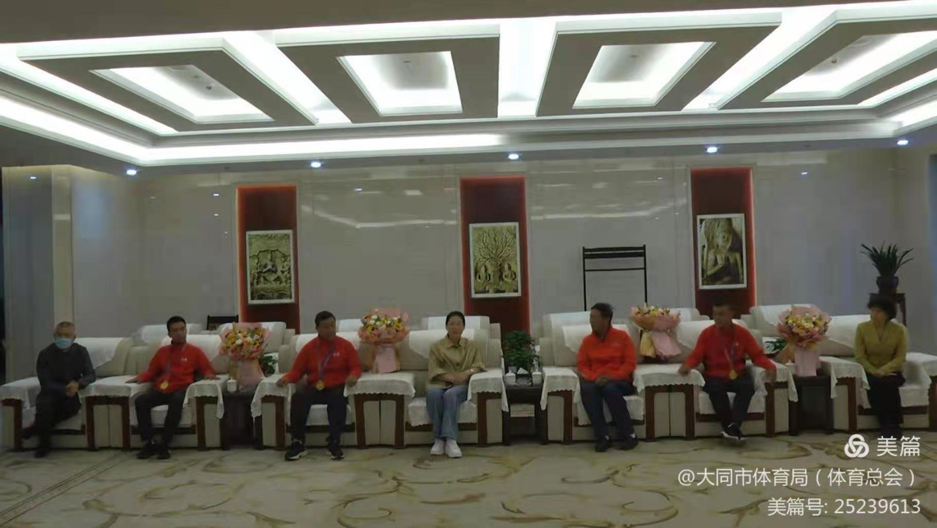 在大同南站,一个简短温馨的欢迎仪式早早就准备妥当,副市长郭蕾、市政府副秘书长曹晖、市体育局局长李春雨、市体育局副局长晋子顺为队员们送上鲜花,向他们表示祝贺和慰问,并亲切合影留念。