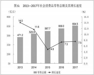 全年全市社会消费品零售总额654.5亿元,比上年增长7.5%。按经营地统计,城镇消费品零售额543.8亿元,增长7.4%;乡村消费品零售额110.7亿元,增长8.0%。按行业统计,全年全市批发业零售额54.5亿元,增长5.5%;零售业零售额520.3亿元,增长7.7%;住宿和餐饮业零售额79.7亿元,增长7.5%。