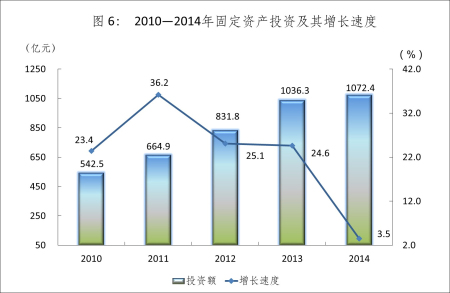 初步核算,全年全市地区生产总值1001.5亿元,按可比价格计算,比上年增长7.4%。其中,第一产业增加值56.9亿元,增长4.0%;第二产业增加值445.5亿元,增长10.8%;第三产业增加值499.1亿元,增长4.2%。第一产业增加值占地区生产总值的比重为5.7%,第二产业增加值比重为44.5%,第三产业增加值比重为49.8%。人均地区生产总值29595元,比上年增长6.8%,按2014年平均汇率计算为4818美元。