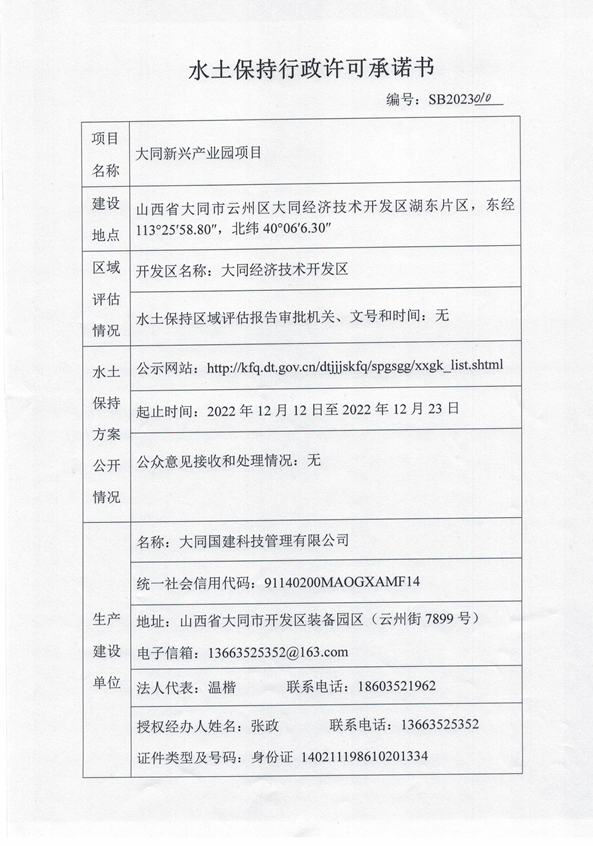 你公司《关于“大同新兴产业园项目水土保持方案报告书”报批的申请》(大新园〔2022〕01号)及所附《大同新兴产业园项目水土保持方案报告书》、《水土保持行政许可承诺书》(SB2023010)收悉。经研究,同意该承诺。
